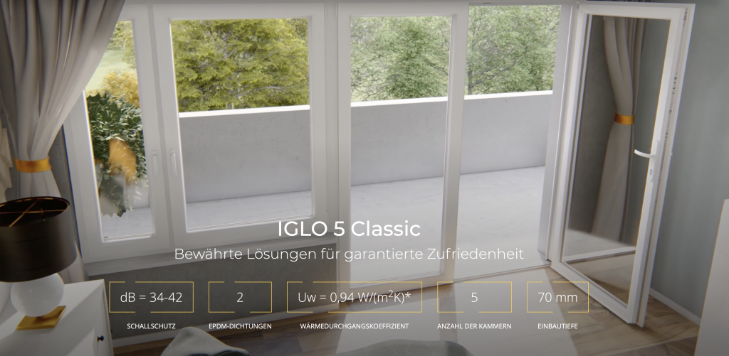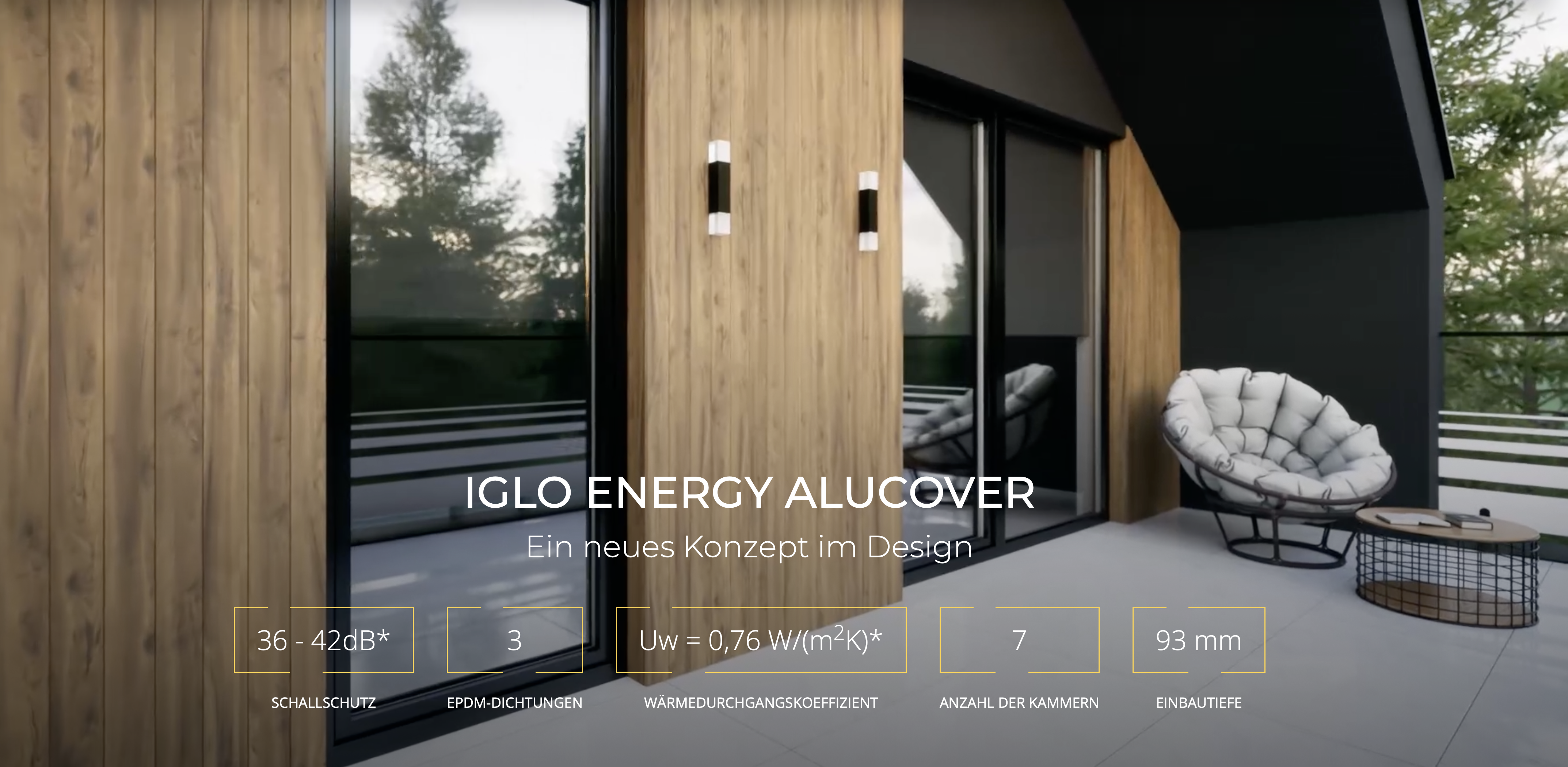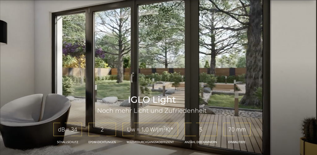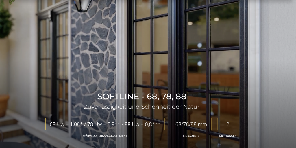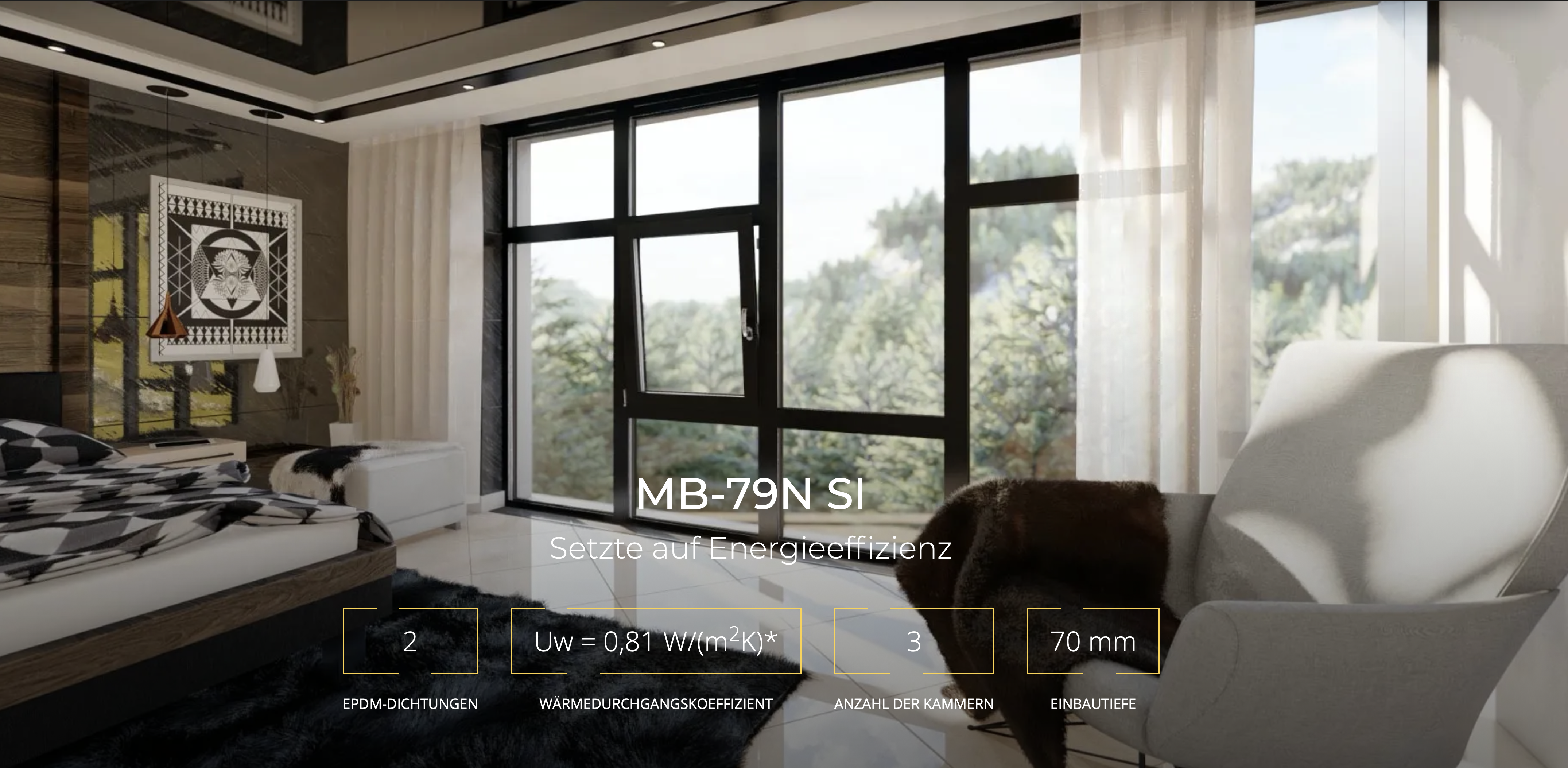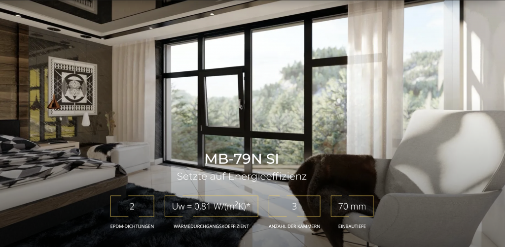 Einzigartiges Design mit der Möglichkeit eckigen Glasleisten zu verwenden, die zu den neuesten architektonischen Trends passen. Das optimale 7-Kammer-Profil-Design, ein speziell entwickeltes EPDM-Schaum-Dichtungssystem und Verglasungspakete mit hohen Wärmedämmparametern sind für die hervorragenden Wärmedämmparameter verantwortlich.