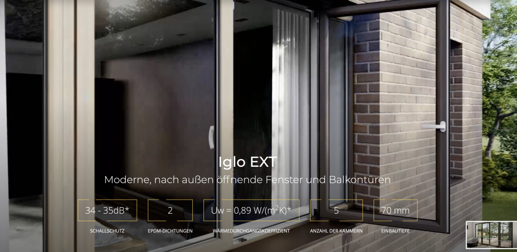 Nach außen öffnende Fenster und Balkontüren des Iglo EXT Systems zeichnen sich durch ihr modernes Design und ihre hervorragende Wärmedämmung aus.