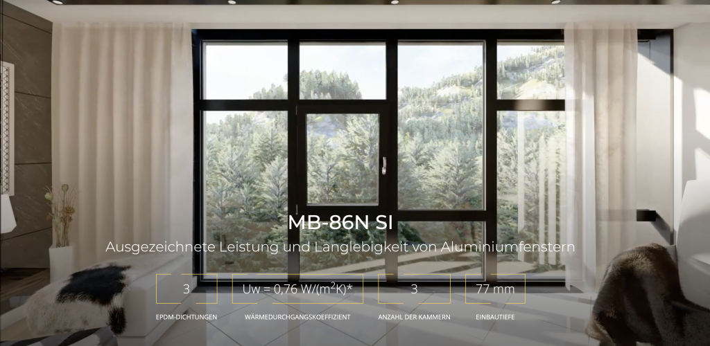 Die MB-86N SI Aluminiumfenster zeichnen sich durch ihre hervorragenden Wärmedämmungseigenschaften und ihr modernes Design aus. Eine Auswahl von mehr als 200 RAL Farben und viele zusätzliche Optionen ermöglichen eine vollständige Personalisierung der Fenster.