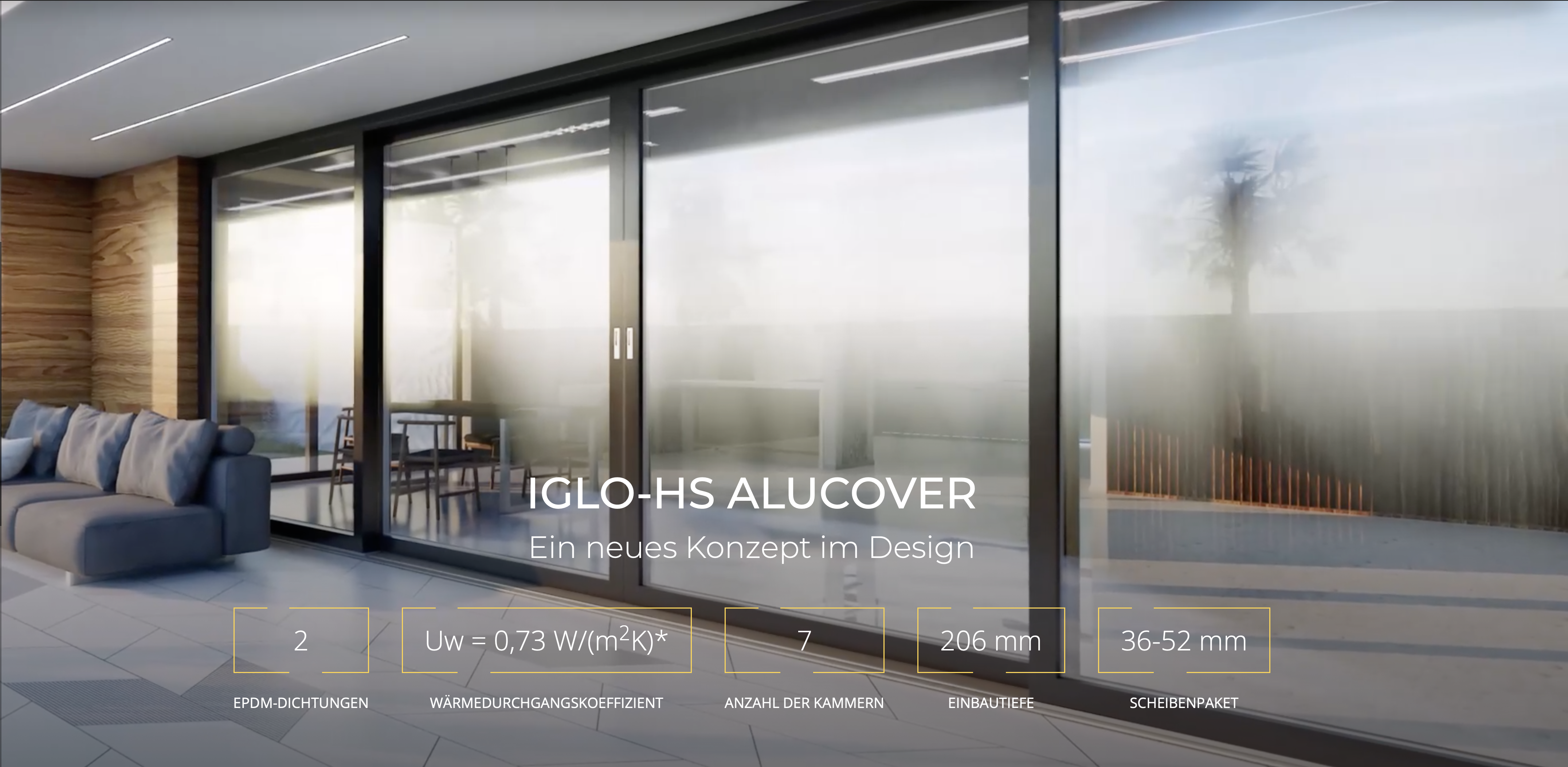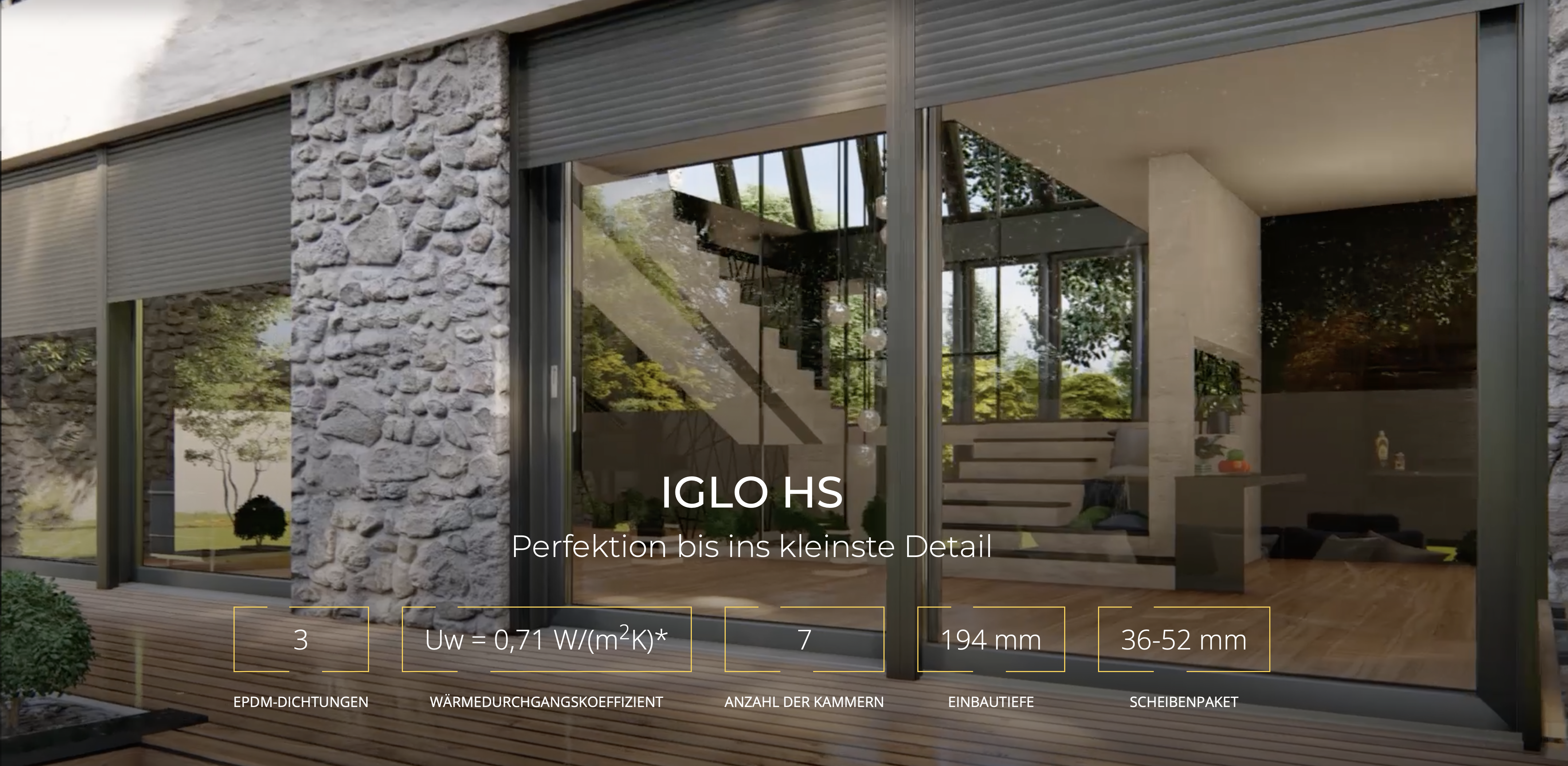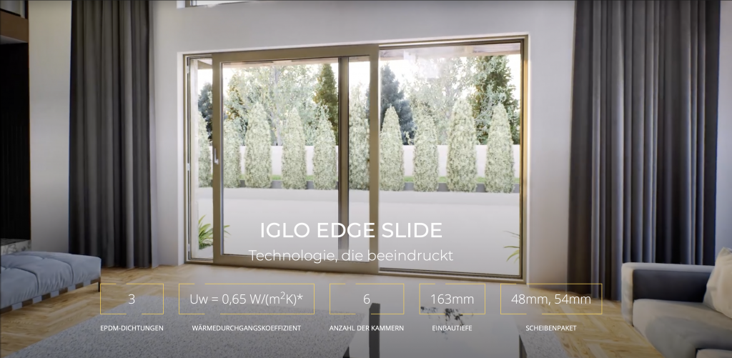 Das neue Terrassensystem zeichnet sich durch einen hohen Wärmedämmwert von Uw = 0,65 W/(m2K)* und eine moderne, eckige Profilform aus, welche im Einklang mit der Iglo Edge Produktlinie steht.